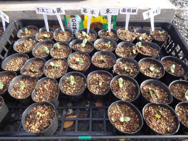 5月3日(土)に最初の発芽が確認されて(写真1番目)、以後、次々と発芽し5月6日(火)にはほぼ全部のポットが発芽しました(写真2番目)。種袋には発芽率は75%と書かれていましたが、発芽しなかったポットは233個のうち9個だけと驚異的な?結果です。