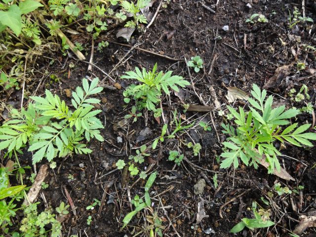4番目の写真は、駐車場の花壇の雑草の間からマリーゴールドの苗がでていました。去年植えた花からできた種が自然に発芽して育ったものだと思われます。