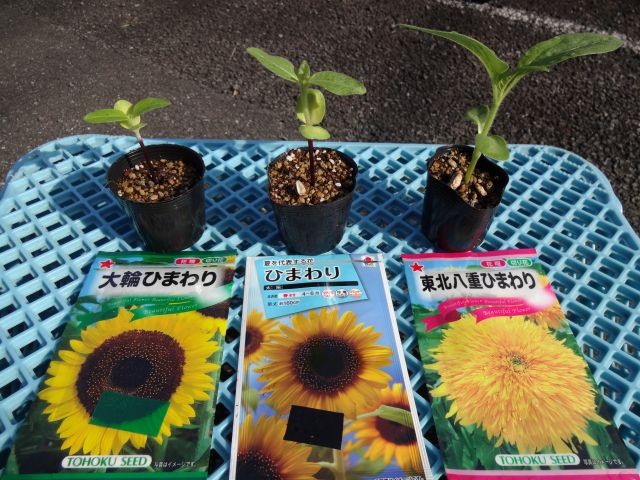3種類のひまわりの種を植えましたが、品種によって生育の早さに違いがあるようです。「八重ひまわり」は本葉が4枚になり、他に比べとても大きく育っています。もう、ポットでは窮屈そうですので、そろそろ花壇に移植しないといけないようです。
