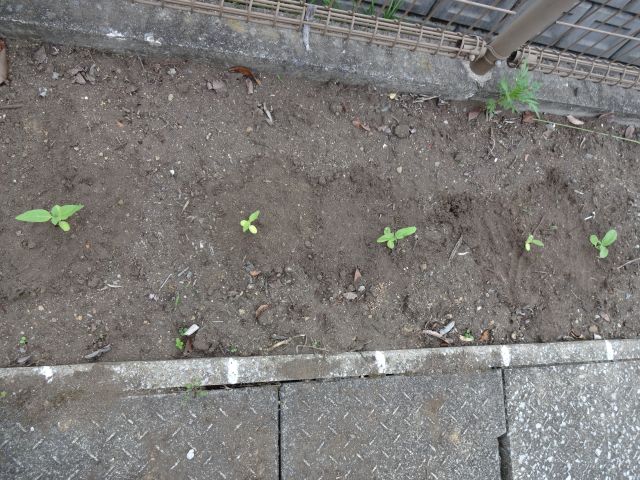 花壇には、自然に発芽したマリーゴールドが、ひまわりよりお先に順調に育っています。