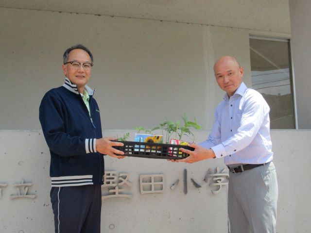 写真は、首藤公宏校長先生に苗をお渡ししたところです。これから、児童の皆さんが理科の教材として成長を観察していくそうです。
