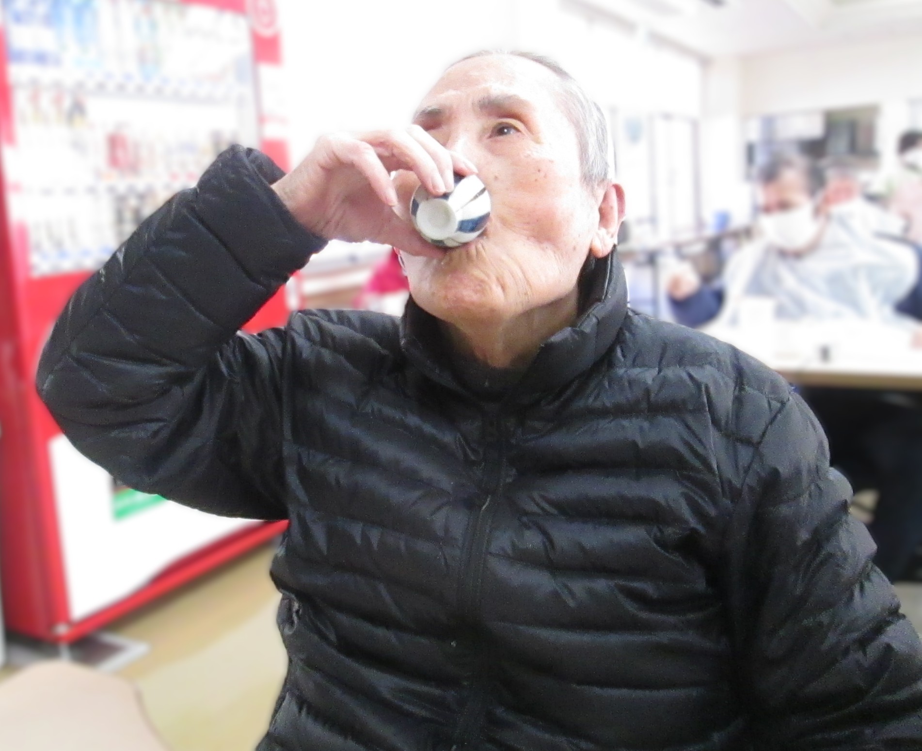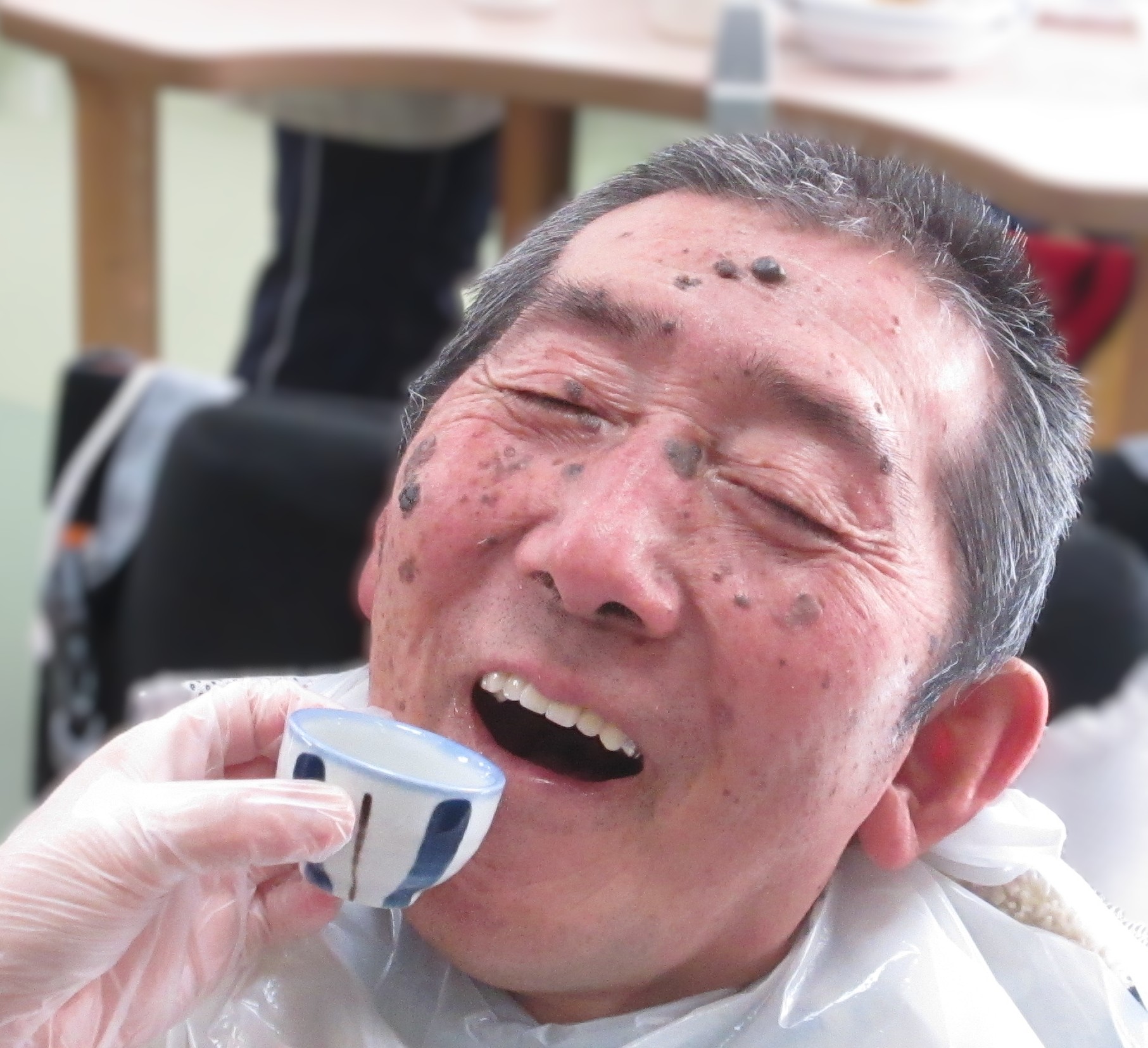 施設長の挨拶、自治会長の乾杯の音頭のあと、お神酒と甘酒で乾杯。